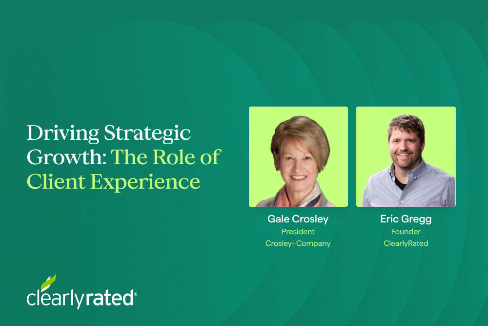 In this webinar, ClearlyRated Founder Eric Gregg, MBA and noted industry consultant and author, Gale Crosley, CPA, CGMA, bring together two distinct but deeply connected disciplines: the measurement science behind client satisfaction and the strategic growth framework which turns that intelligence into optimized firm-wide growth. Together, they will unpack what a high-growth culture really looks like when client experience sits at the center of every leadership decision.